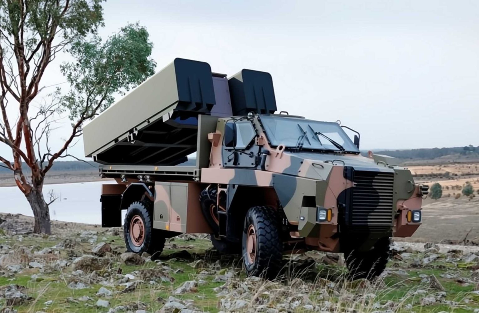 Un lanzador de misiles NSM de estilo antiguo montado sobre un Jelcz de 3 ejes.