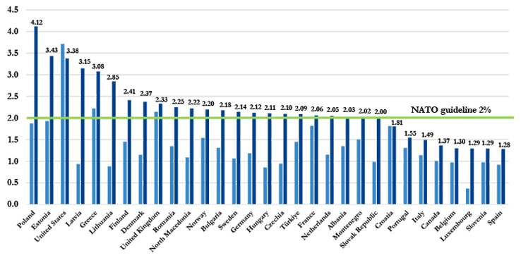 Tabla comparativa porcentual del gasto en defensa de los miembros de la OTAN. Fuente: Real Instituto de Estudios Estratégicos Elcano. F. Arteaga.