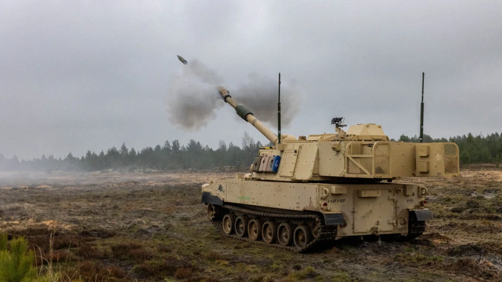 Soldados estadounidenses del 2.º Batallón, 82.º Regimiento de Artillería de Campaña, Artillería de División, 1.ª División de Caballería, disparan un obús autopropulsado M109A7 Paladin del Ejército de EE. UU. durante la competición Best By Test en Adazi, Letonia, el 15 de diciembre de 2025. (Foto del Ejército de EE. UU. por el soldado de primera clase Gabriel Martinez) Breaking Defense