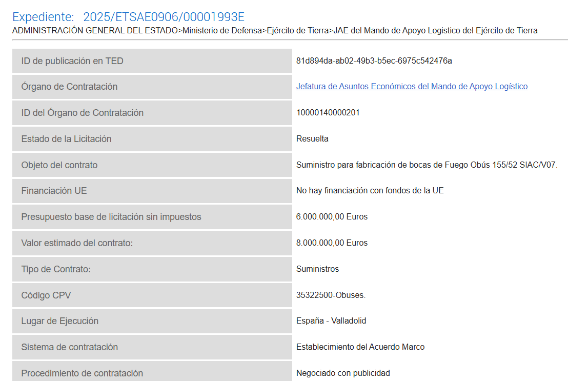 El Ministerio de Defensa, a través del Mando de Apoyo Logístico del Ejército de Tierra, ha resuelto una licitación para la fabricación de bocas de fuego del obús 155/52 SIAC/V07, con un presupuesto base de 6 millones de euros (sin impuestos) y un valor estimado total de 8 millones de euros. El expediente, identificado como 2025/ETSAE0906/00001993E, contempla el suministro de estas piezas clave para la artillería de campaña.