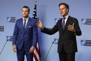 El secretario general de la OTAN, Mark Rutte, a la derecha, y el secretario de Defensa de Estados Unidos, Pete Hegseth, se dirigen a una conferencia de prensa durante una reunión de ministros en la sede de la alianza militar en Bruselas. (AP Foto/Geert Vanden Wijngaert)