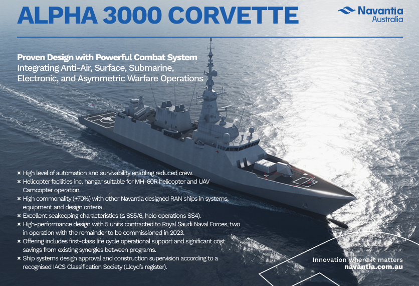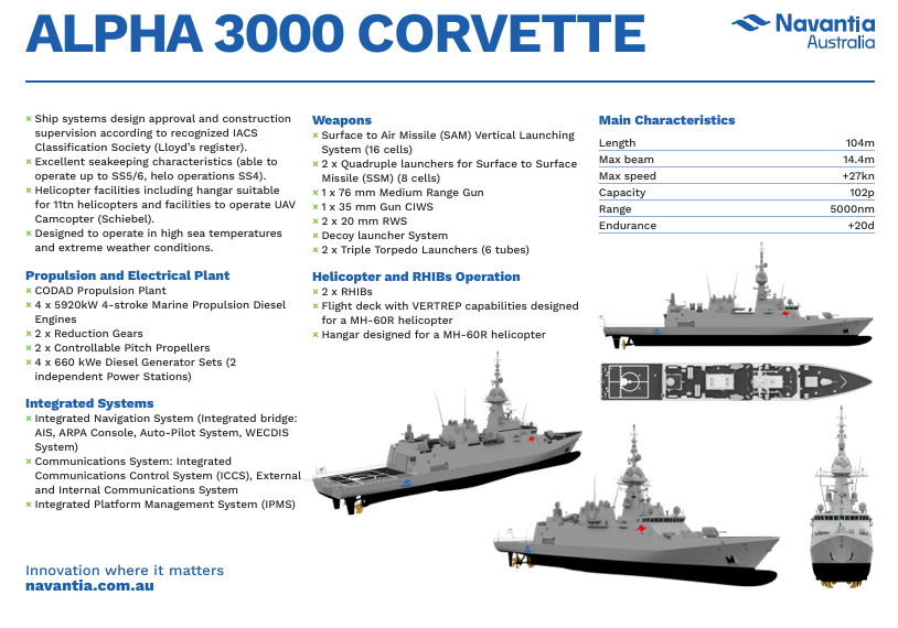 En sus materiales comerciales, Navantia presenta la ALPHA-3000 como una fragata ligera multimisión, con capacidad operativa 360º, sistema de misión integrado, vigilancia avanzada mediante radar, sonar y optrónica, y cubierta de vuelo, hangar y 2 embarcaciones rápidas. La ficha comercial, en este caso de la versión ofrecida en Australia -muy similar, pero más alargada y co mayor desplazamiento que la saudí-, concreta, además, unas características principales de 104 metros de eslora, 14,4 metros de manga máxima, más de 27 nudos de velocidad máxima, dotación de 102 personas, alcance de 5.000 millas náuticas y más de 20 días de autonomía. A ello suma una planta propulsora CODAD, con 4 motores diésel de 5.920 kW, 2 reductoras, 2 hélices de paso controlable y 4 grupos diésel generadores de 660 kWe. En armamento, la configuración que aparece en esa misma ficha contempla un VLS de 16 celdas para misiles superficie-aire, 2 lanzadores cuádruples para misiles superficie-superficie, un cañón de 76 mm, un CIWS de 35 mm, 2 estaciones remotas de 20 mm, sistema lanzaseñuelos y 2 lanzadores triples de torpedos. En el plano aéreo, el buque está preparado para operar con helicóptero MH-60R, dispone de capacidad VERTREP, puede embarcar 2 RHIB y, según el fabricante, ofrece instalaciones para UAV tipo Camcopter y operación hasta estado de mar 5/6, con operaciones aéreas en estado de mar 4.